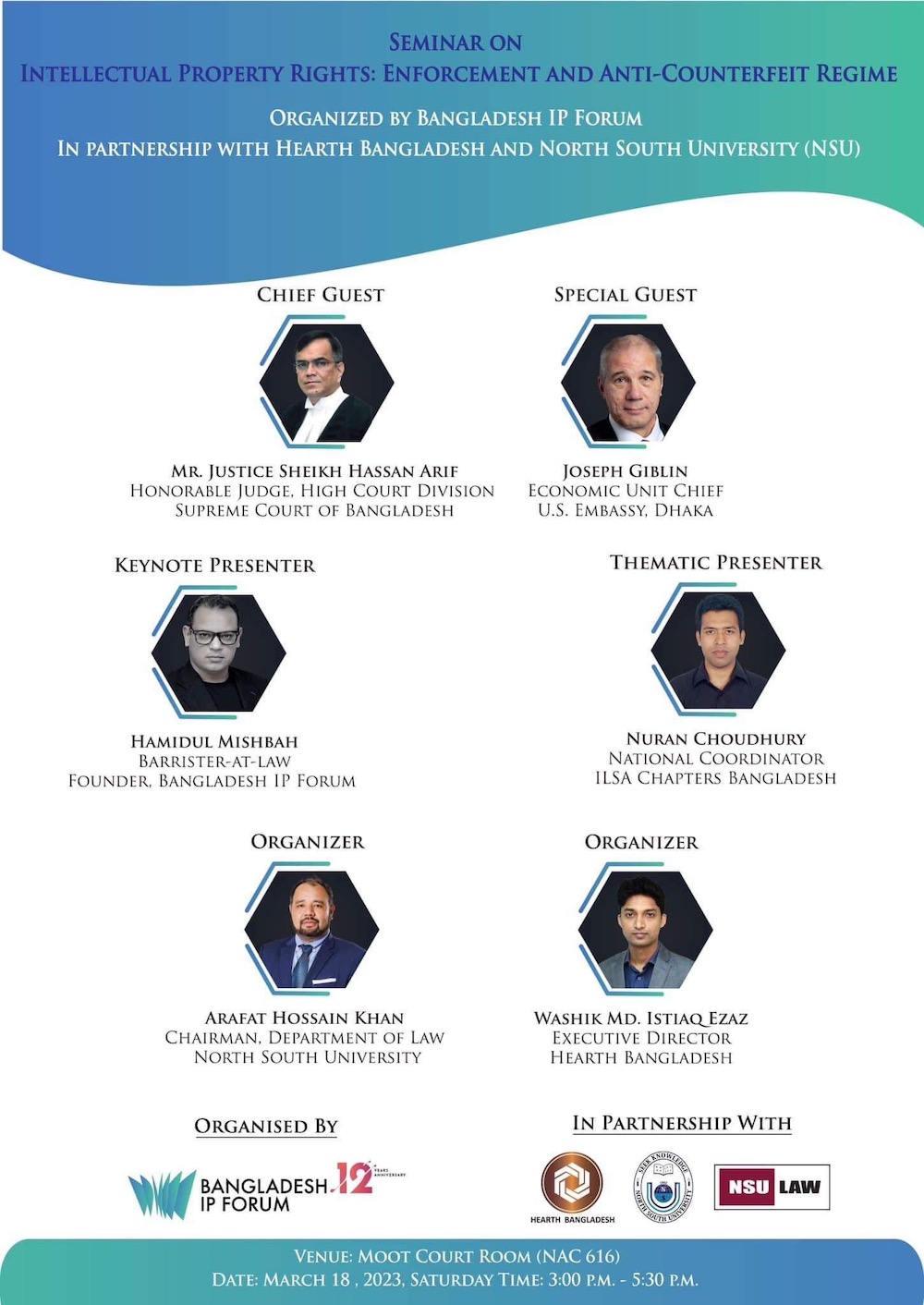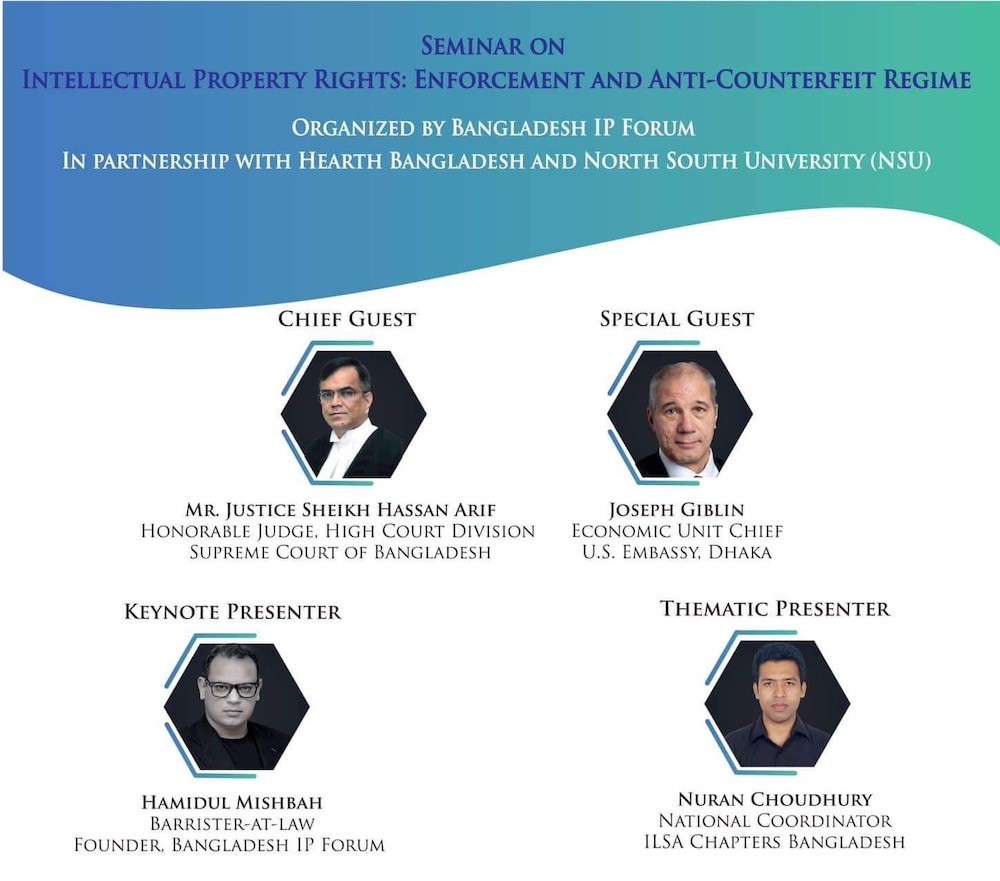 Hearth Bangladesh organized this seminar with Bangladesh IP Forum. The seminar was designed to discuss the vulnerability of counterfeit regime and challenges of enforcing intellectual property rights in Bangladesh. Nuran Choudhury, National Coordinator, ILSA Chapters Bangladesh presented thematic notes and Hamidul Mishbah from Bangladesh IP Forum delivered the keynote speech. Among other dignitaries present Joseph Giblin, Economic Unit Chief, U.S. Embassy, Dhaka attended the seminar as special guest and Justice Sheikh Hasan Arif, honorable Judge, High Court Division, Supreme Court of Bangladesh was present as the chief guest. The seminar was attended by over 100 law students and young academics from over 20 institutions.