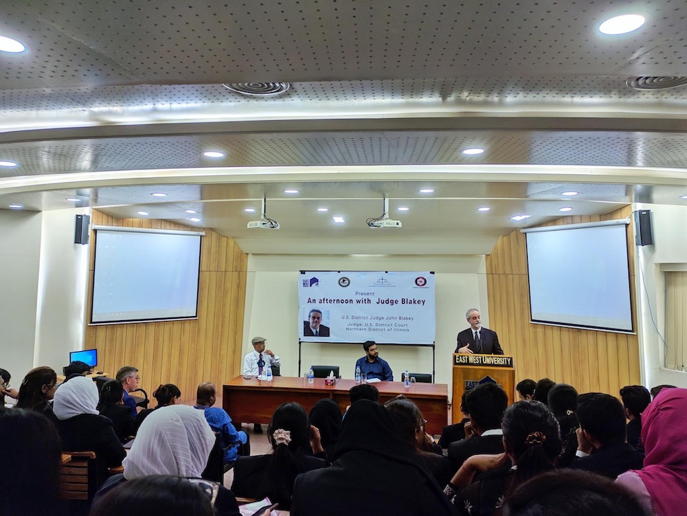 Hearth Bangladesh organized this talk with the support of U.S. Department of Justice’s Office of Overseas Prosecutorial Development, Assistance and Training (DOJ:OPDAT) and Department of Law, East West University. This talk offered a unique opportunity to hear directly from a U.S. Judge who is also familiar with the legal system of Bangladesh. Judge John Robert Blakey is a United States district judge of the United States District Court for the Northern District of Illinois and former Illinois prosecutor. Judge Blakey answered numerous questions regarding U.S. Justice delivery system and explained how trial and advocacy skills can become universal. The talk was both educational and enlightening.